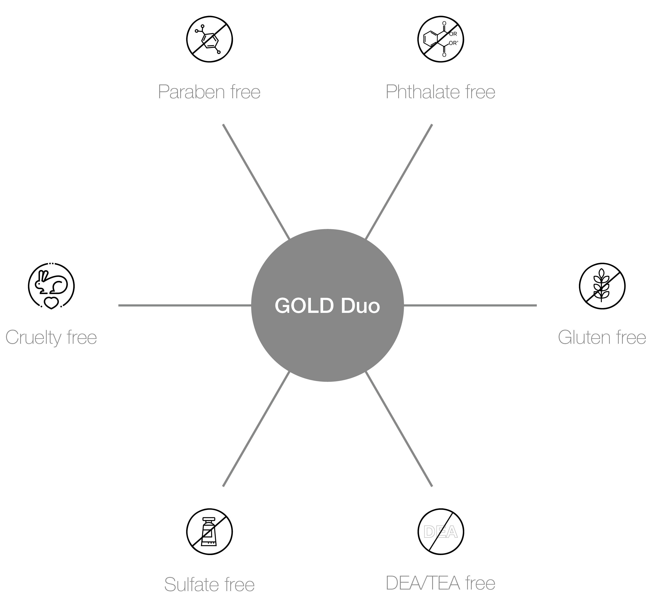 A: No. Gold Duo is a 100% sulfate-free formula and contains no harsh chemicals such as parabens, glutens, phthalates, and DEA/TEA.