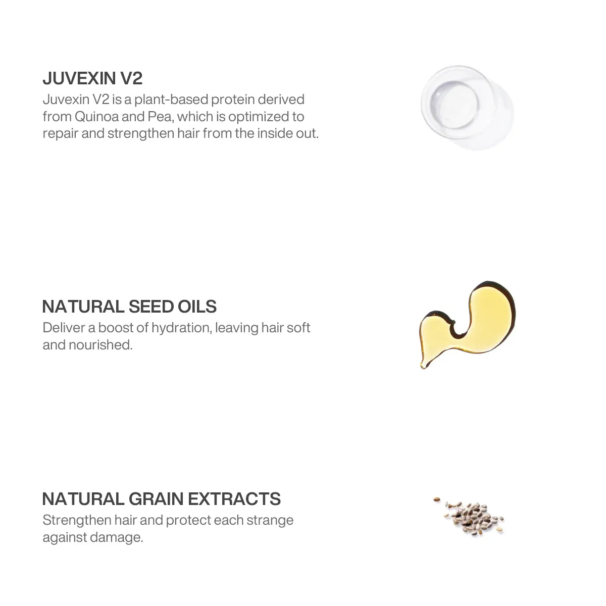 Juvexin V2: Juvexin V2 is a plant-based protein derived from Quinoa and Pea, Which is optimized to repair and strengthen hair from the inside out.