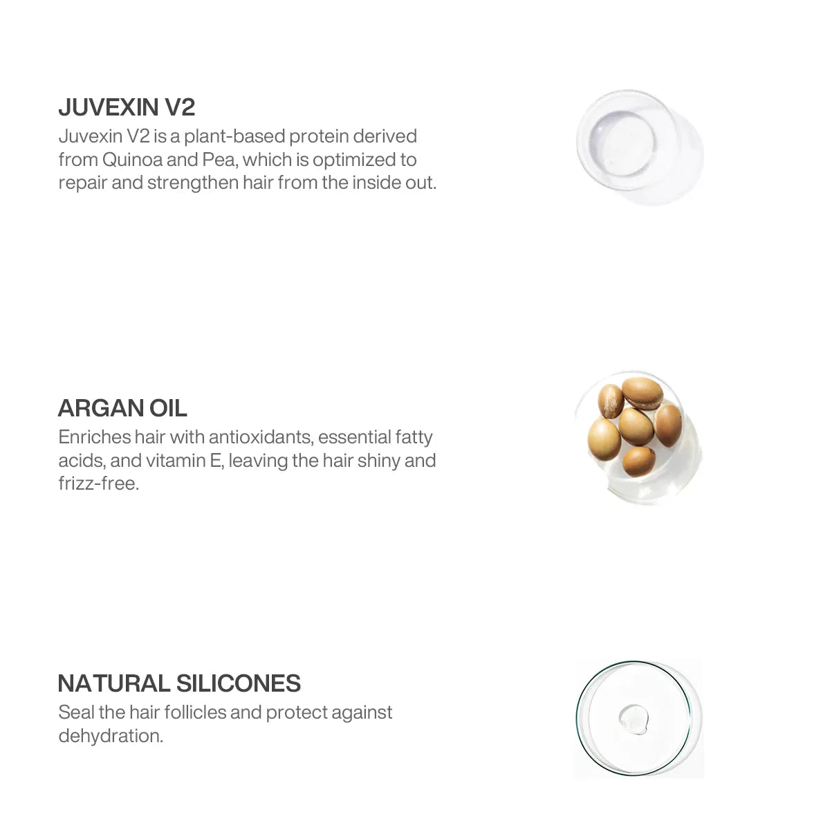 Juvexin V2: Juvexin V2 is a plant-based protein derived from Quinoa and Pea, Which is optimized to repair and strengthen hair from the inside out.