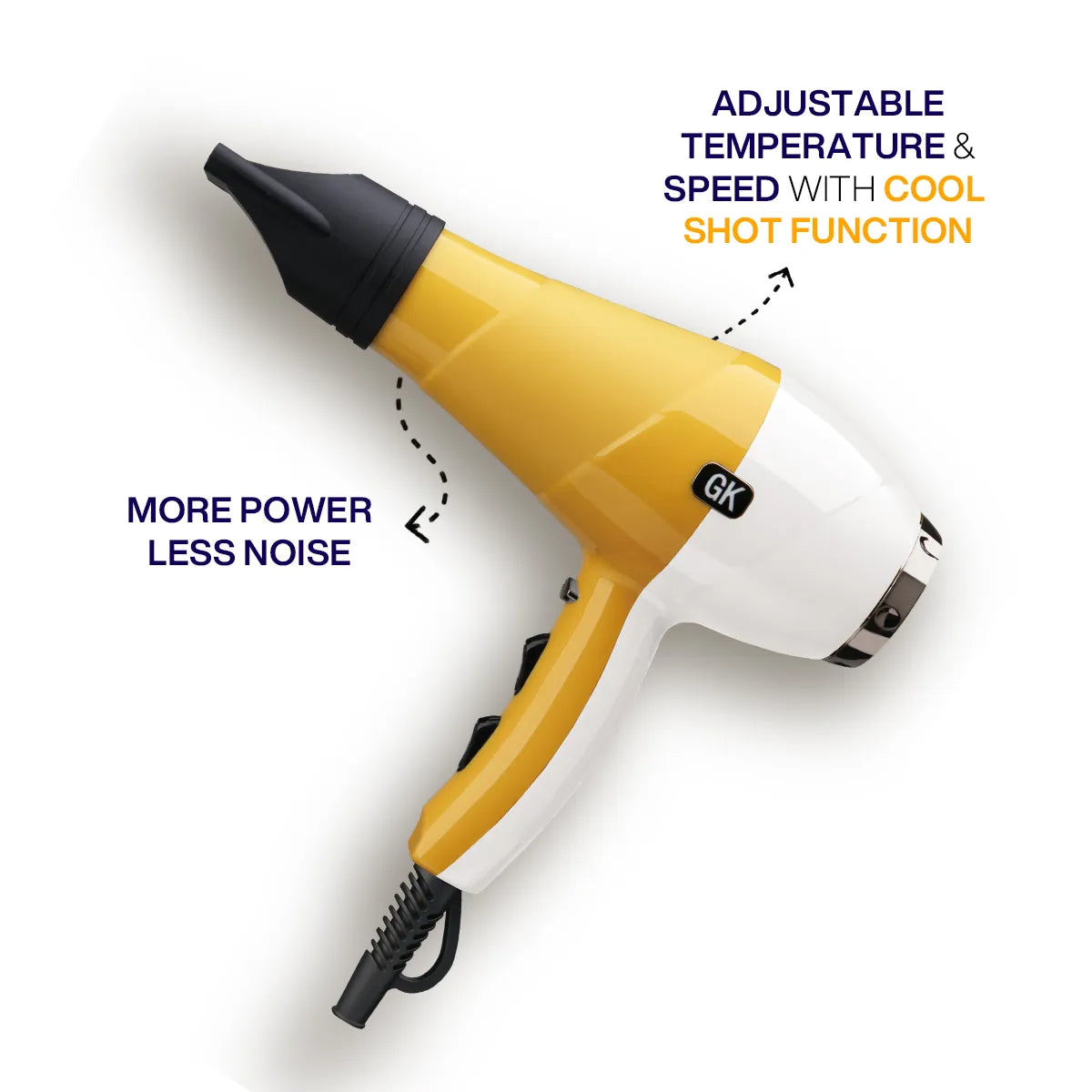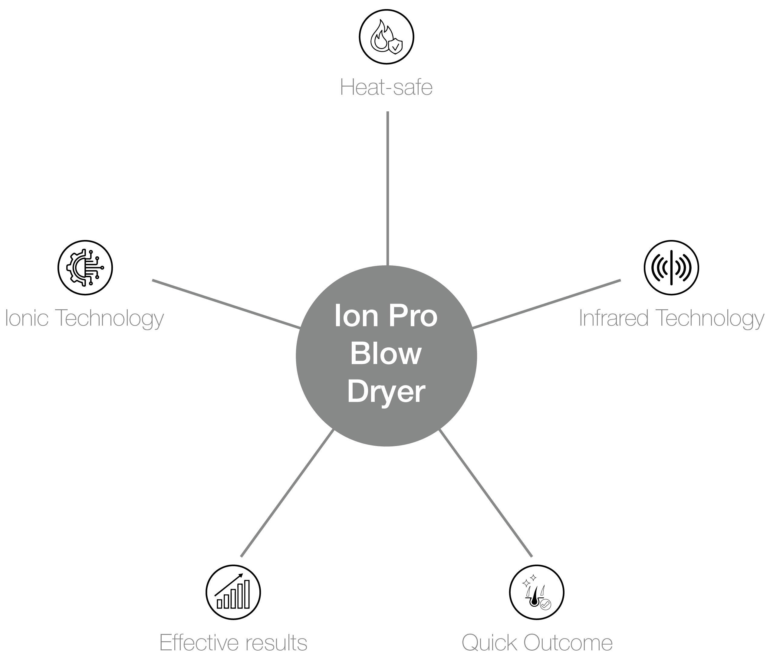 A: The Ion Pro is a state-of-the-art blowdryer that uses ionic technology and infra-red technology to create the perfect blow out while preventing heat damage to the hair. The Ion Pro uses a reliable, high-quality AC motor for strong airflow that enables better styling. It also features a cool shot function to make for the ideal blowdryer.