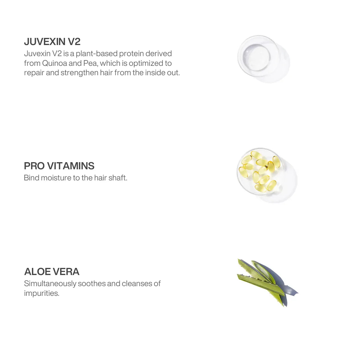 Juvexin V2: Juvexin V2 is a plant-based protein derived from Quinoa and Pea, Which is optimized to repair and strengthen hair from the inside out.